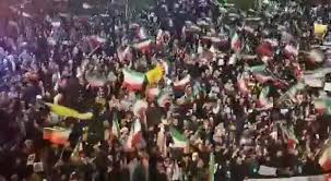 انطلقت في المدن الإيرانية مسيرات شعبية كبيرة احتفالاً بالنصر، وذلك عقب إعلان وقف إطلاق النار بعد الموافقة الأميركية على الشروط الإيرانية.